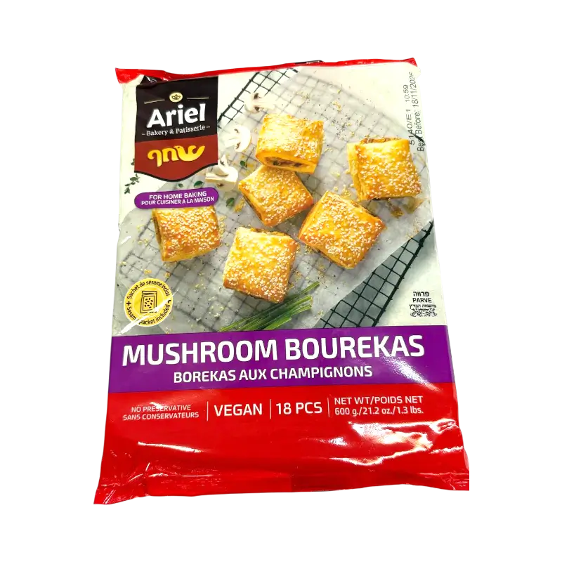 Frozen puff pastry bourekas filled with a savory mushroom filling, prepared for home baking.