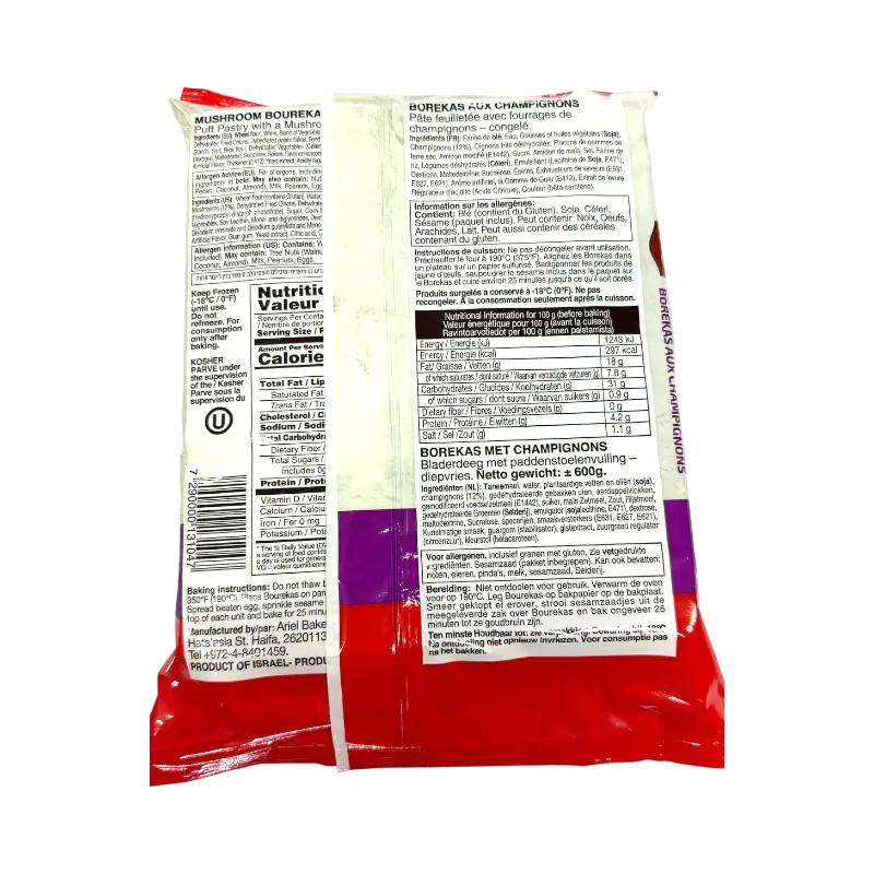 Ingredients: Wheat flour, water, vegetable oils (soy), mushrooms 11%, onion, modified starch, salt, spices, emulsifiers (E471, E472c), acidity regulator (citric acid), color (beta-carotene), sesame seeds.