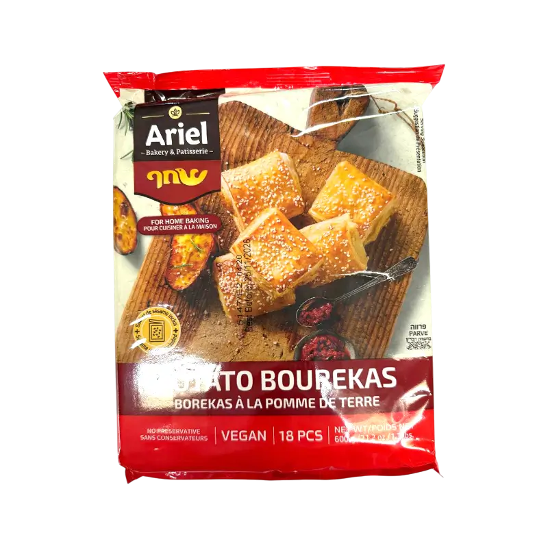 Ingredients: Wheat flour, water, vegetable oils (soy), potatoes 11%, onion, modified starch, salt, spices, emulsifiers (E471, E472c), acidity regulator (citric acid), color (beta-carotene), sesame seeds.