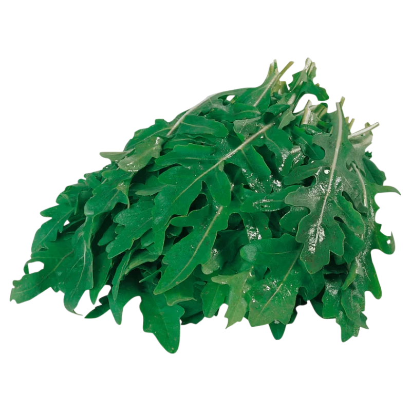 Fresh wild arugula features deeply serrated dark green leaves with a glossy surface and delicate stems.