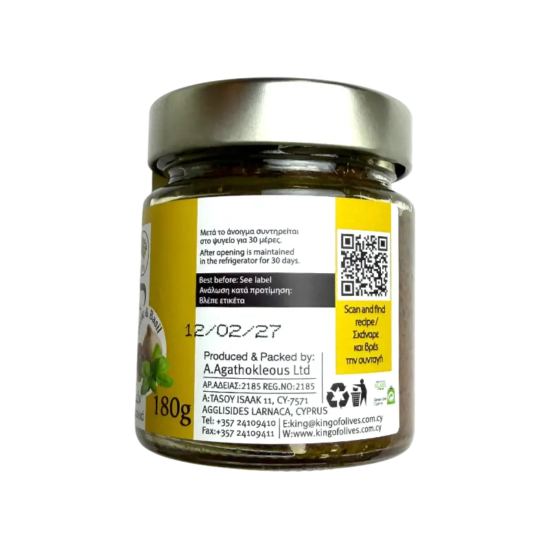 Olive paste made from Kalamon olives, blended with extra virgin olive oil, black garlic, basil, and herbs. This spread offers a rich olive flavour with a mild garlic aroma and herbal notes.