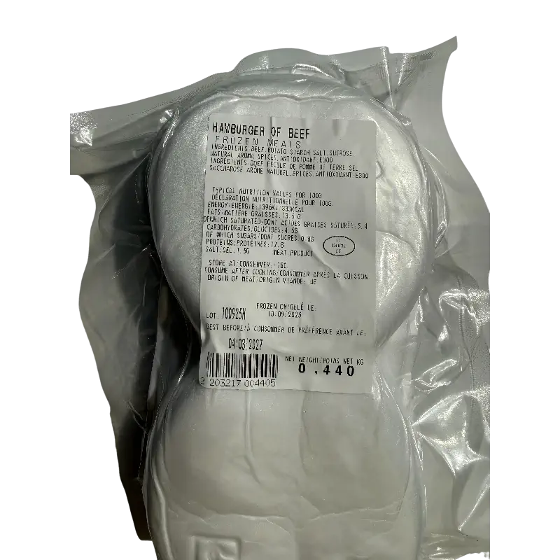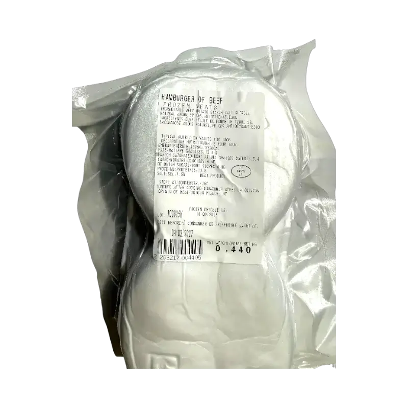 Frozen beef burger patties. Ready-to-cook meat product made from beef with added seasoning and binders.