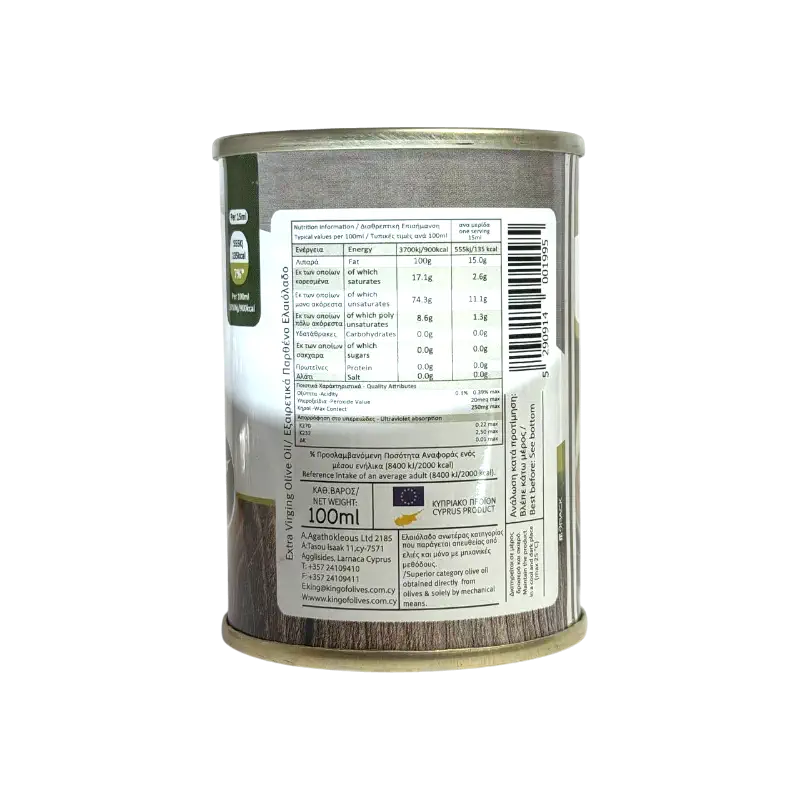 Extra virgin olive oil with ultra low acidity of 0.3%, produced by a traditional olive harvesting family company.