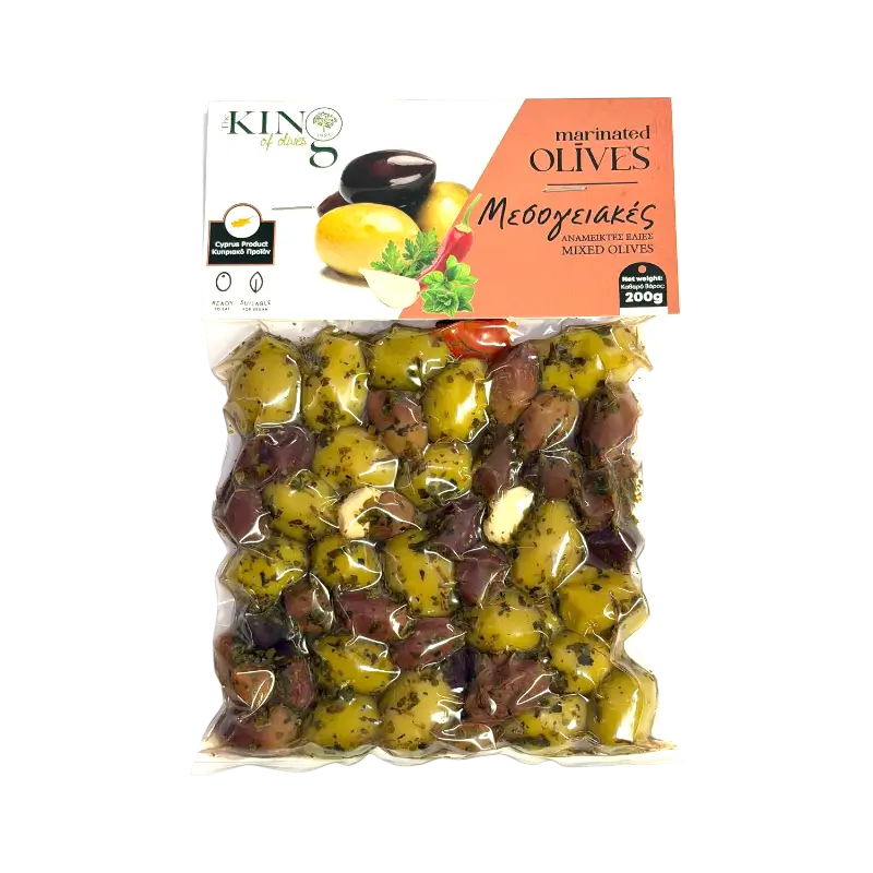 Combination of green and black olives seasoned with herbs, garlic, and spices.